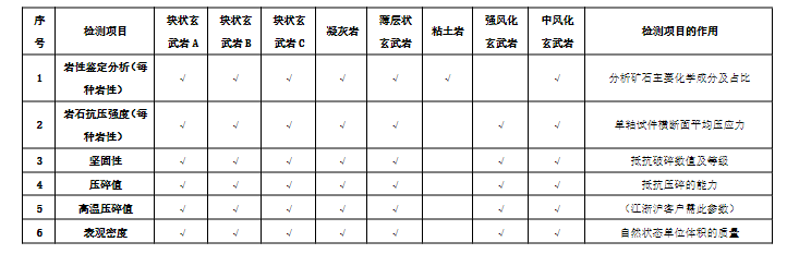 (6)招標(biāo)范圍及內(nèi)容:對(duì)諭興礦礦區(qū)南側(cè)+5m以上8種玄武巖原石檢測(cè)(檢測(cè)項(xiàng)目具體如下表)。檢測(cè)成果需滿足國(guó)家法律法規(guī)、行業(yè)檢測(cè)標(biāo)準(zhǔn),提供技術(shù)咨詢服務(wù)與集料破碎。